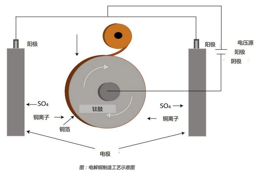 電解銅箔的制造技術中,銅箔是從含銅離子化學溶液中沉積到旋轉的鈦鼓上形成的。 鈦鼓與直流電壓源相連,其中電源陰極連接到鈦鼓上,陽極浸沒在銅電解質溶液中。 當施加電壓時,鈦鼓以非常慢的諫度旋轉,銅溶液裡面的銅離子在電流的牽引下就會慢慢地沉積到鈦鼓的陰極表面。 鈦鼓的內側銅表面是較光滑的,而另一側的銅表面相對而言較粗糙。 鈦鼓轉動速度越慢,沉積的銅就會越厚,反之亦然。 銅箔的光滑面和粗糙面在經過不同的處理流程後,就可以適用於印刷電路板的製作了。 銅箔經過工藝處理後,可以增强銅與介質資料之間的結合力。 另一個優點是,可以減緩銅的氧化來起到抗變色的作用。